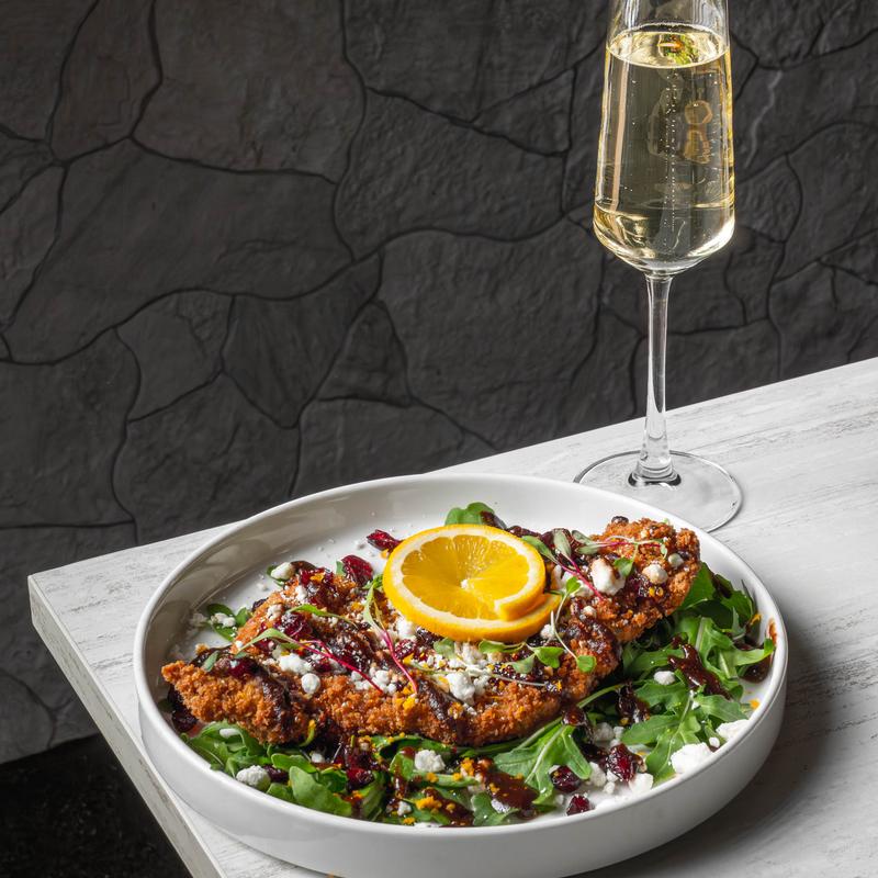Panko chicken breast, goat cheese, figs, orange, cranberries, and arugula.