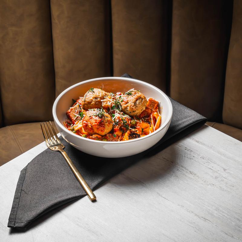 Imported Italian noodles, creamy vodka tomato sauce, eggplant, peas, spinach, and mushrooms.